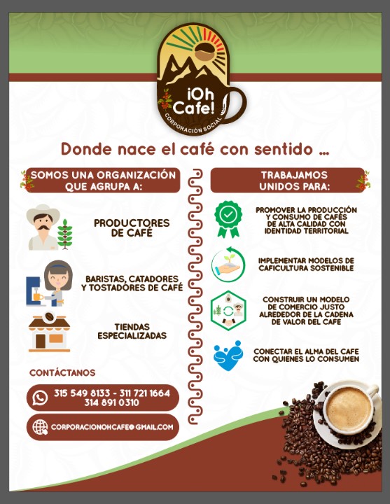 La corporación Social Oh Café, es una organización sin animo de lucro donde buscamos trabajar con los caficultores, productores, baristas, catadores, tostadores y tiendas especializadas de café de Santa Rosa de Cabal. Con el fin de desarrollar un modelo Socioeconómico basado en la producción y comercialización de cafés de alta calidad, el comercio justo, la sostenibilidad ambiental y la cultura cafetera en Santa Rosa de Cabal.